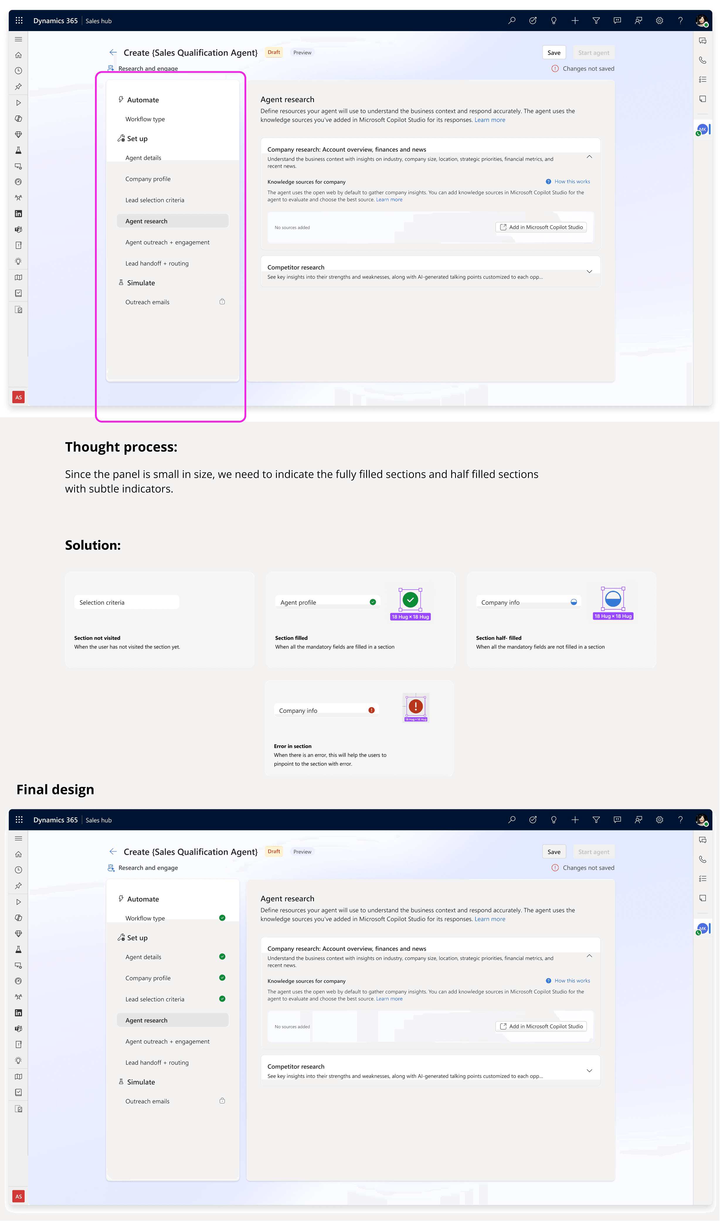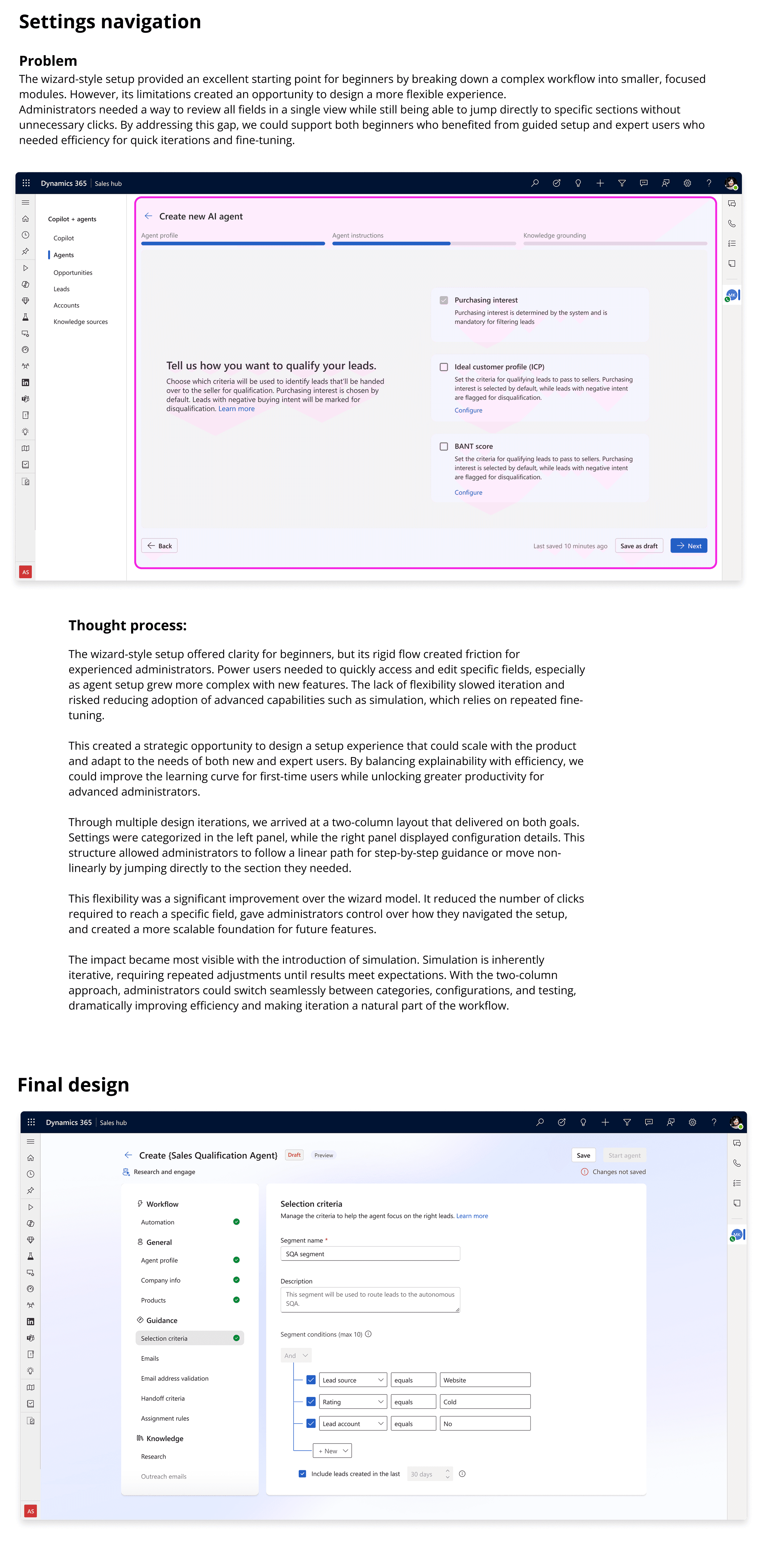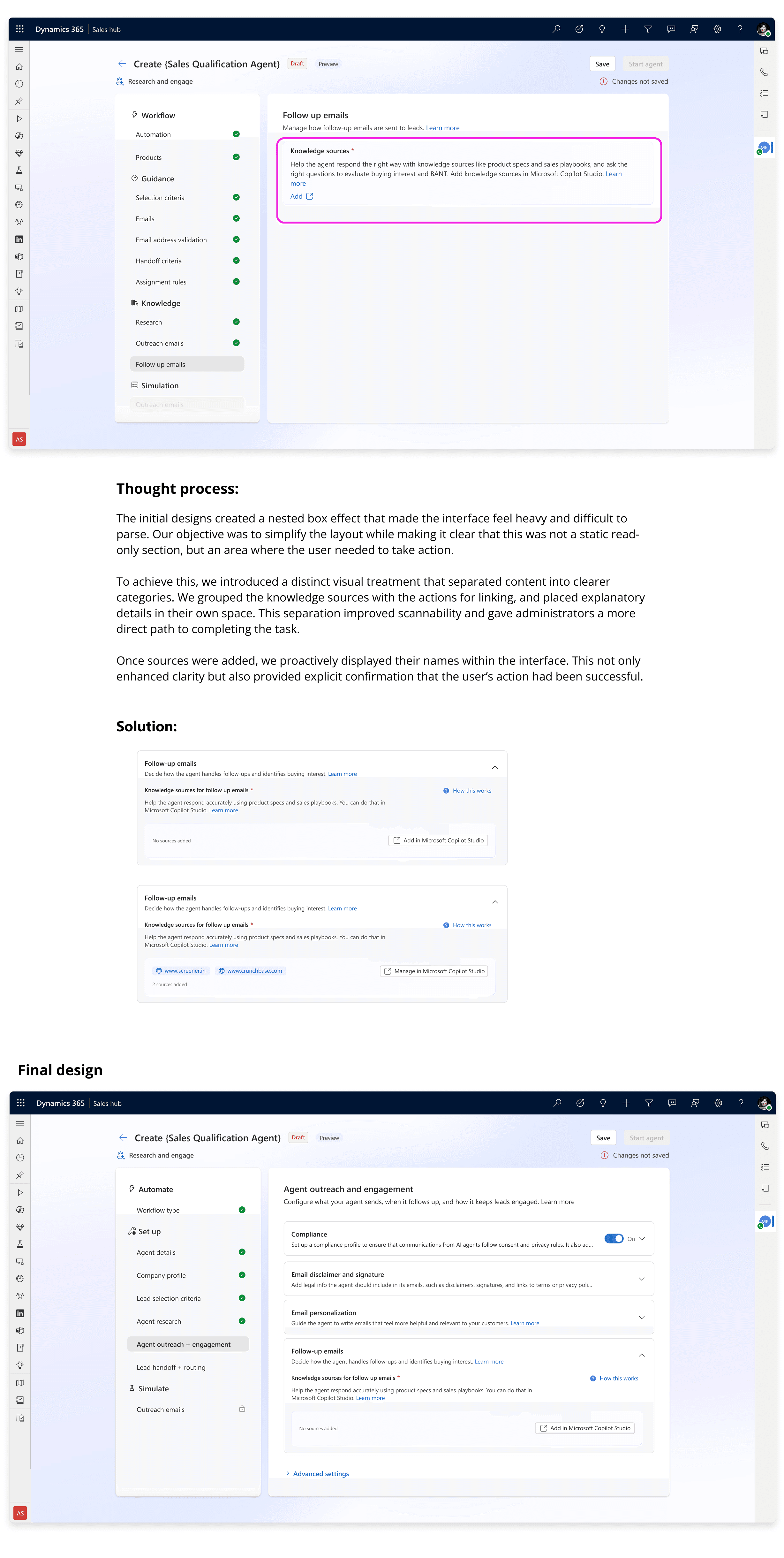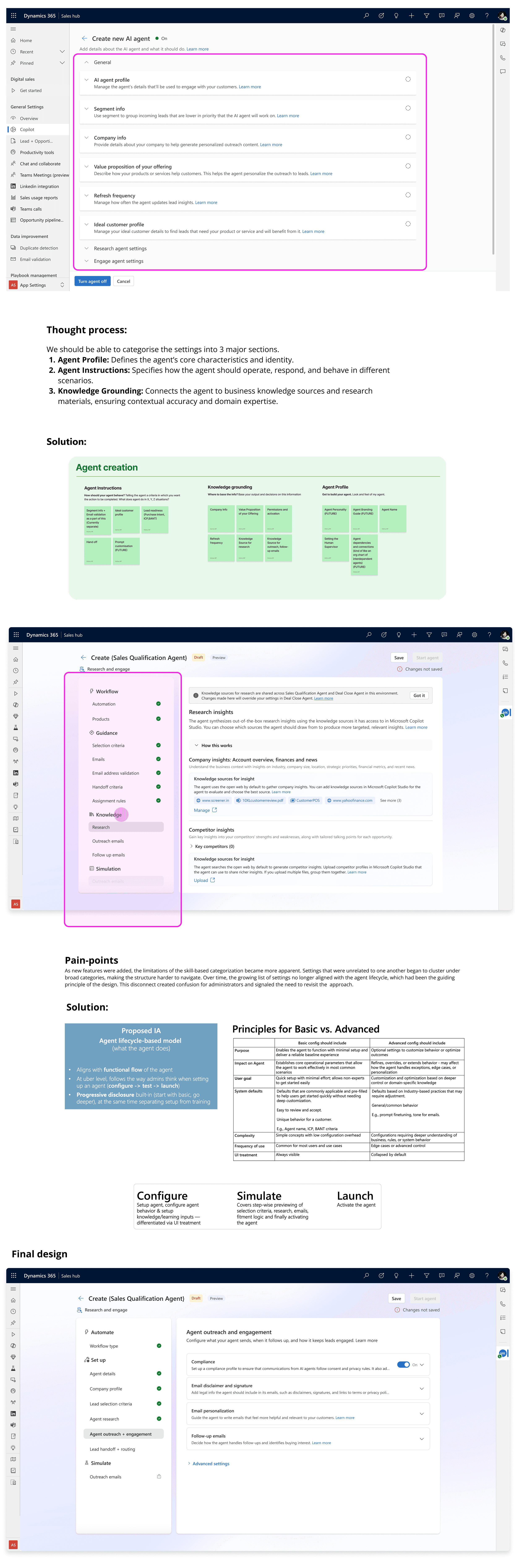 This was the most critical decision in the project. At the start, there was no existing mental model for configuring autonomous agents inside Dynamics 365. Whatever structure we introduced here would not only shape the Sales Qualification Agent, but become the foundation for all future agents across the platform.