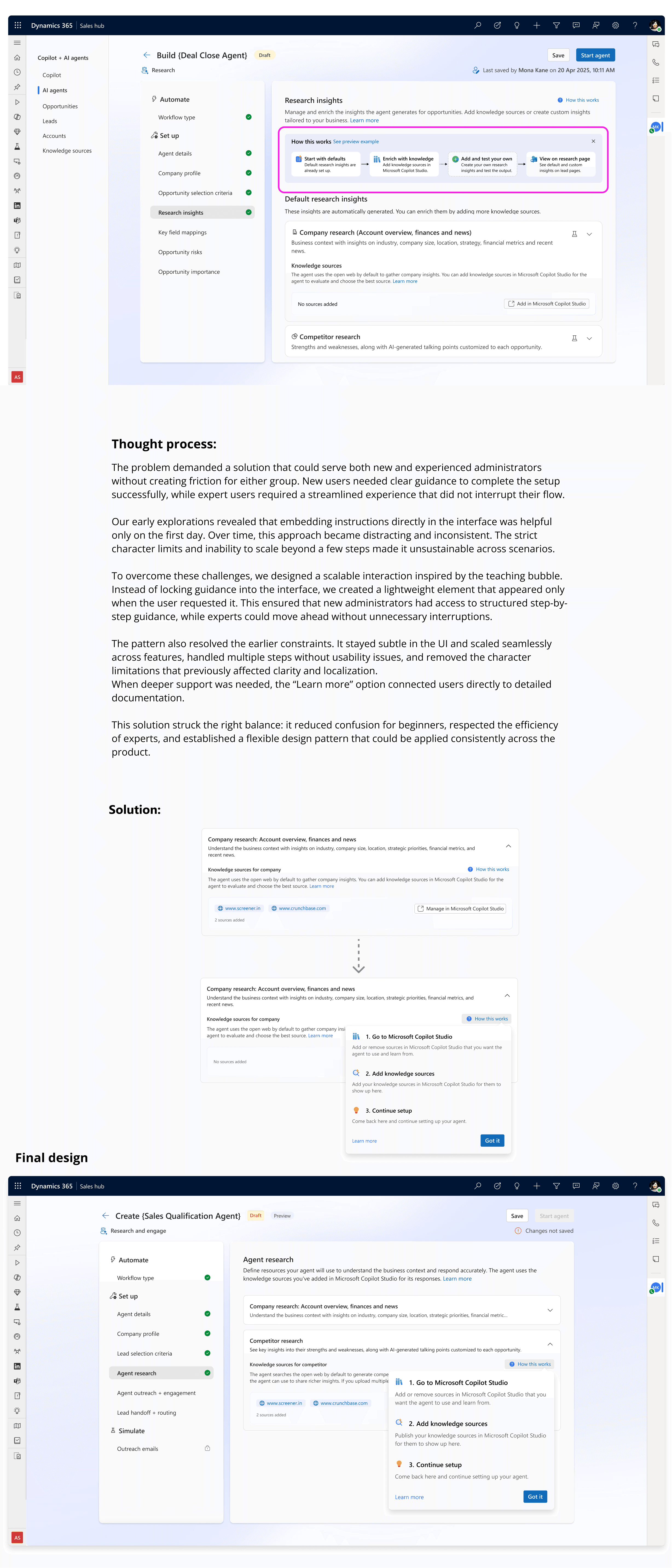 The work established the foundation that now powers several autonomous agents across Dynamics 365. It transformed a complex and highly technical problem into a clear and approachable setup experience that administrators can understand and trust. The project moved from concept to General Availability in a fast paced eight month period and became a key driver of Microsoft’s investment in agent based systems. Early customer data shows a strong increase in lead conversion outcomes, validating both the design strategy and the product direction.