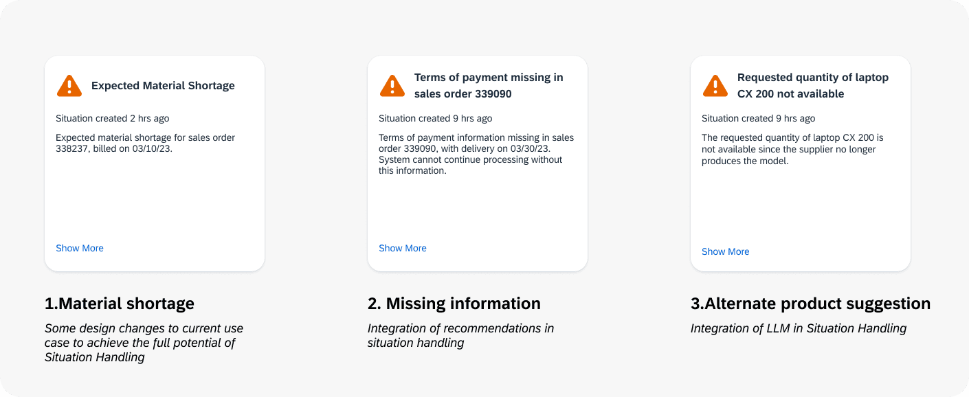 Situation Handling required a mix of system understanding, UX clarity, and strategic thinking. The work covered redesigning current capabilities, shaping the future of AI-enabled exception handling, and aligning teams across domains. The resulting experience supports users across a wide range of business situations and contributes to SAP’s vision for the Intelligent Enterprise.