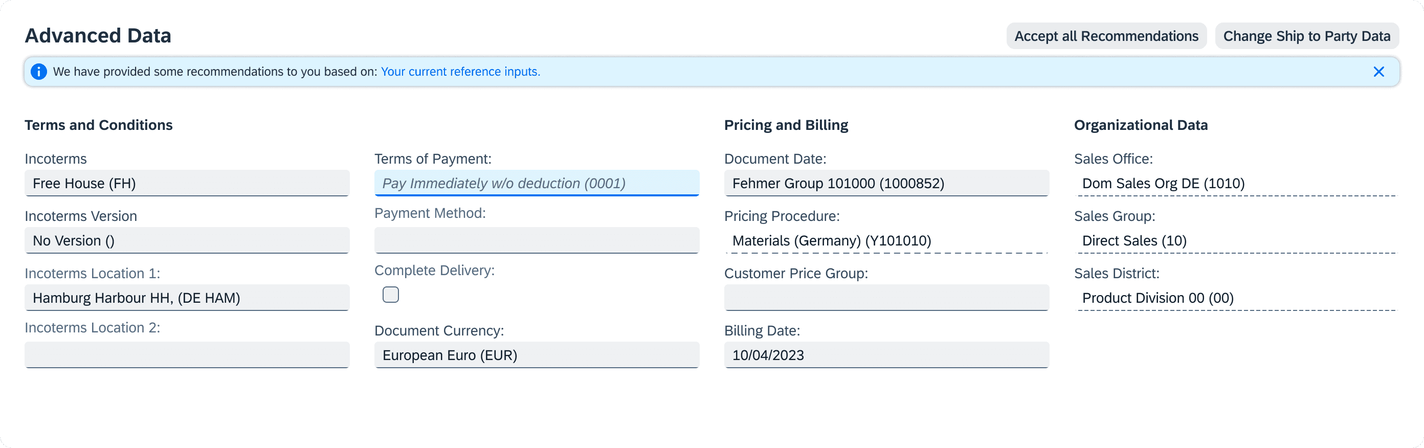 • For missing payment information, the form includes a system recommendation that can be confirmed with one action.